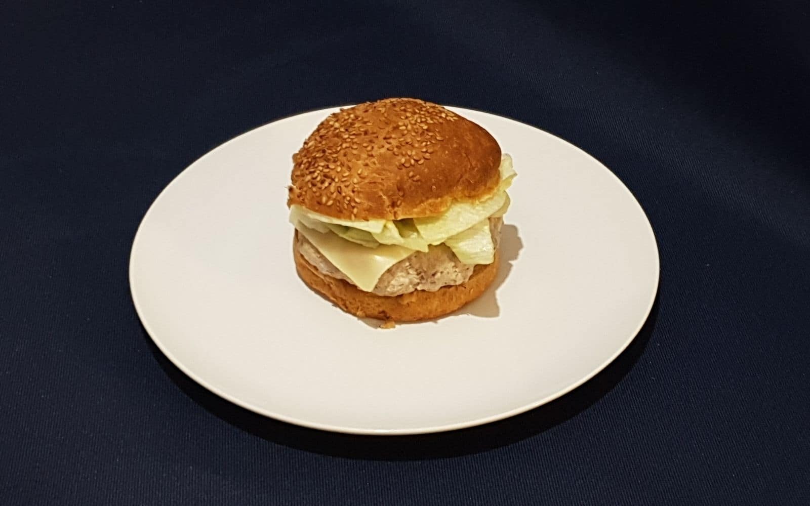 Uzeti burger zemičku i obe polovine namazati sa burger sosom, na jednu polovinu staviti luk i krastavčiće, na drugu iceberg. Kada je meso gotovo staviti na donju polovinu zemičke i preko njega list kačkavalja kako bi se rastopio dok je meso još vruće. Poklopiti drugom zemičkom.